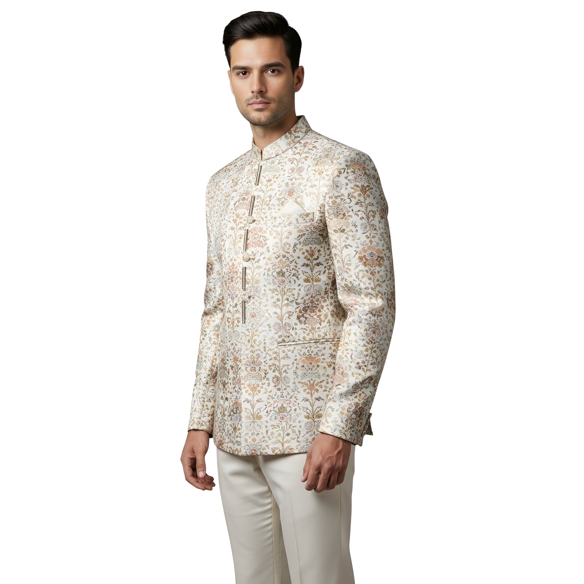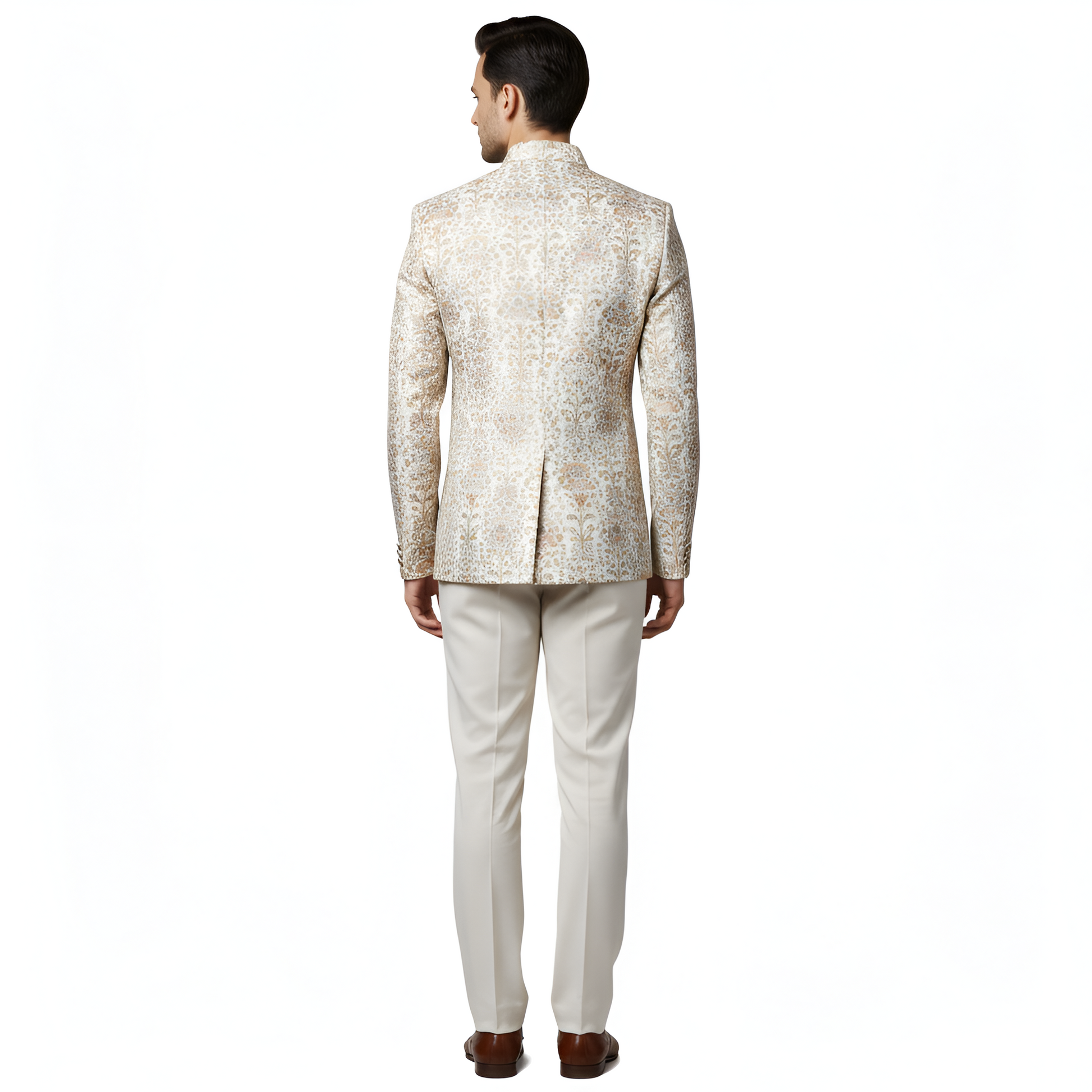 Step into a legacy of royalty with the Bespoke Imperial Heritage Bandhgala Suit - Beige and Gold. This outfit is a celebration of classic Indian craftsmanship, designed for the groom who seeks a traditional yet profoundly luxurious aesthetic. The light, creamy base provides a sophisticated backdrop for a sprawling garden of intricate floral and botanical motifs.