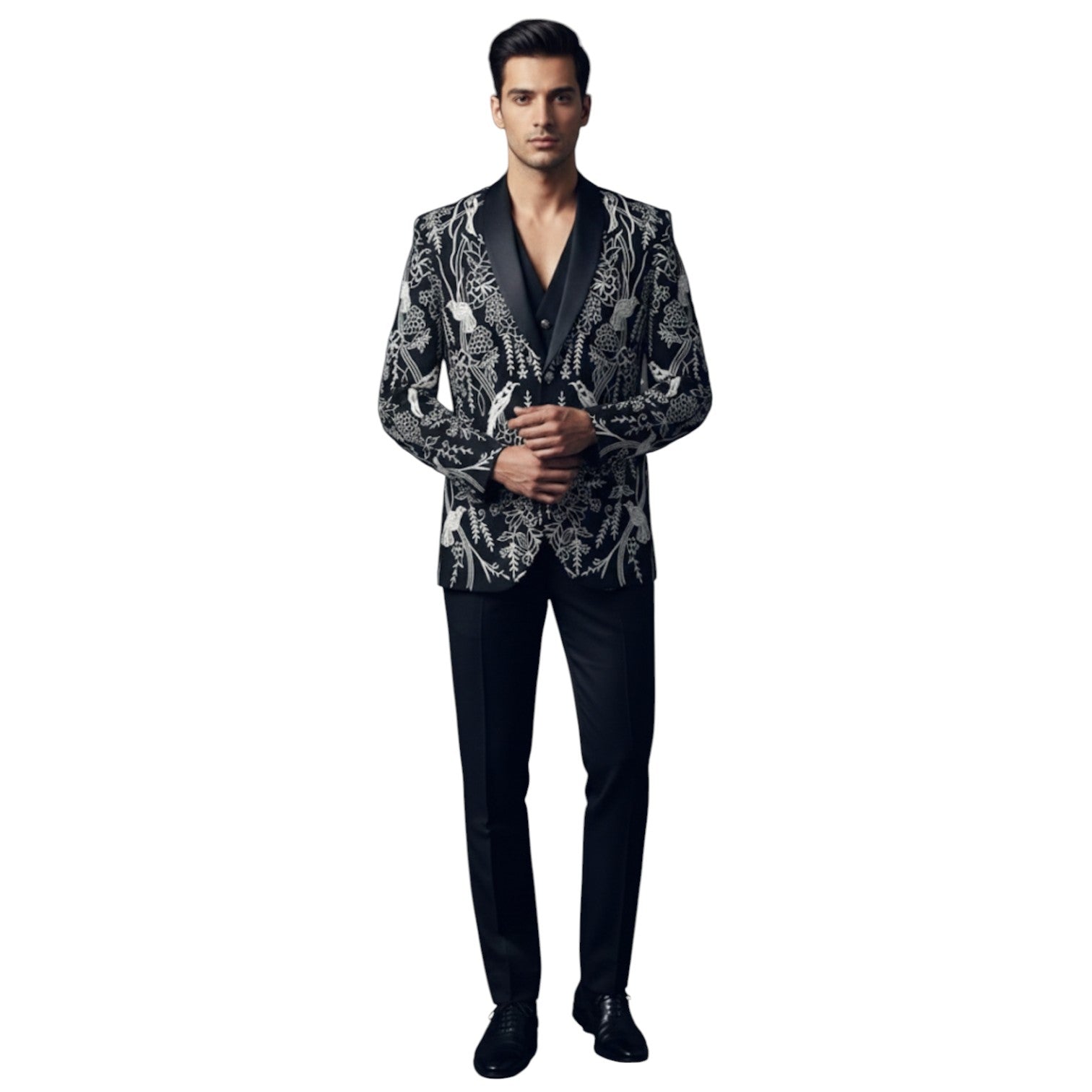 Precision Silhouette: Expertly tailored to a slim fit, ensuring that despite the heavy embroidery, the suit maintains a sharp, clean, and flattering shape.