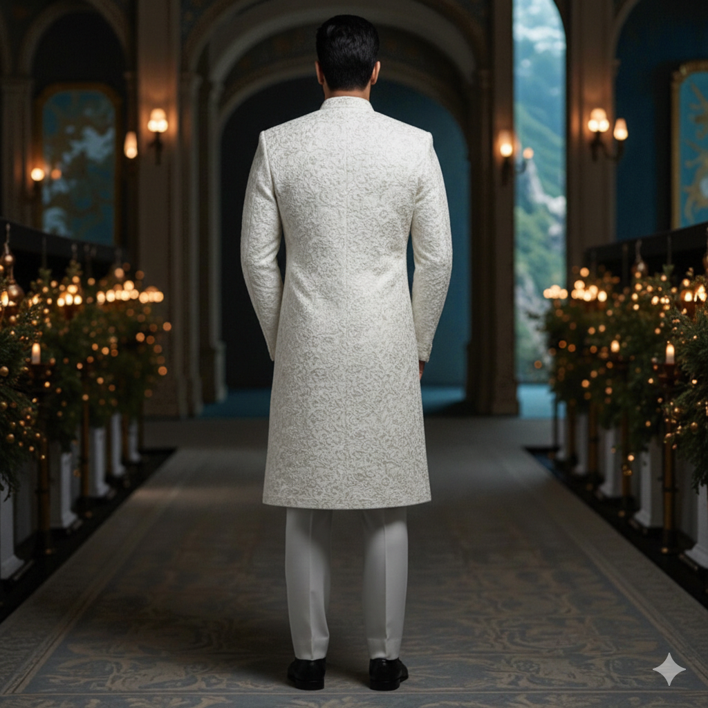 Description: This Sherwani is a masterpiece of modern ethnic tailoring, featuring a rich cream foundation with a unique triple-layered hemline. The design combines sharp geometric structures with traditional floral motifs, creating a powerful and sophisticated silhouette for a high-profile groom.