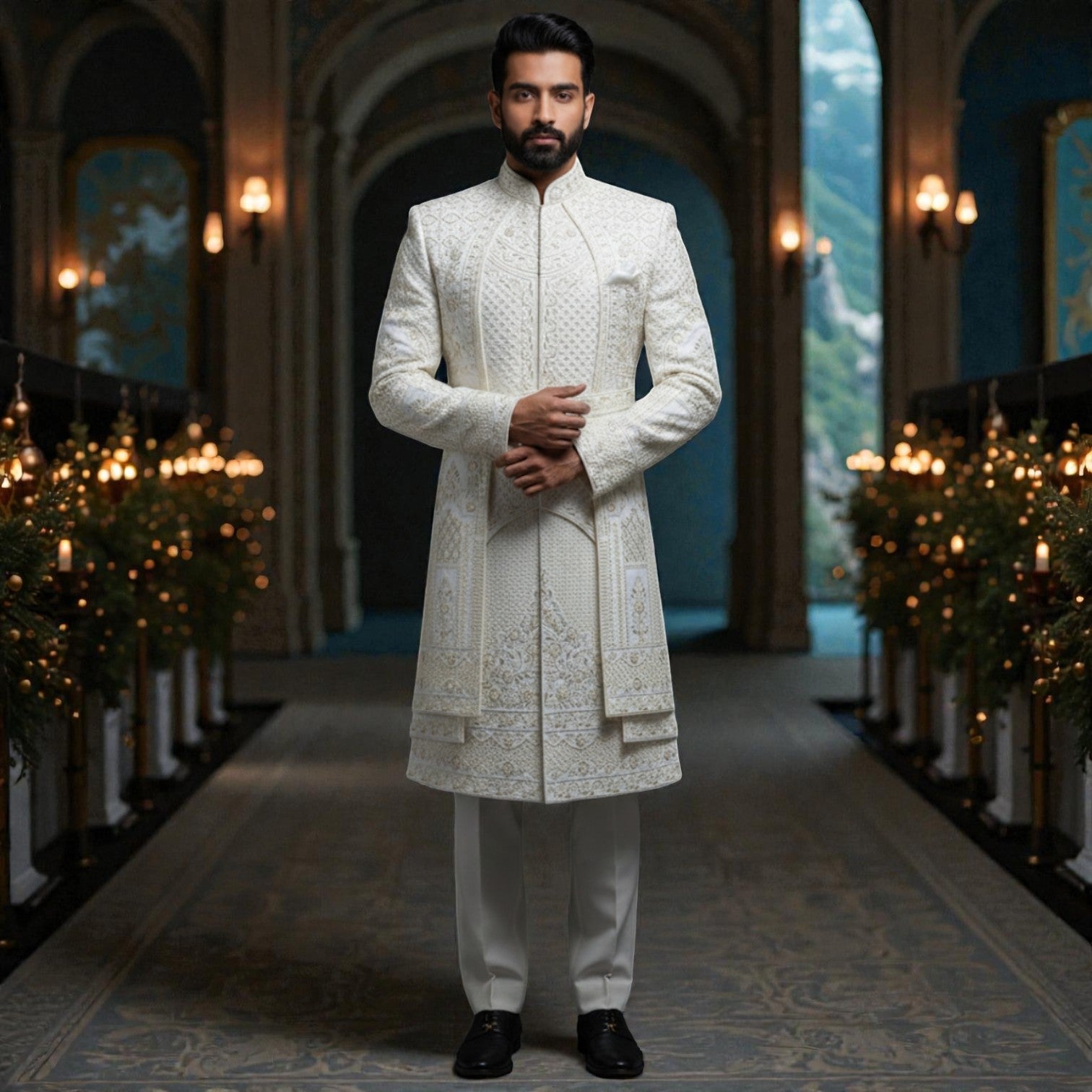 This Sherwani is a masterpiece of modern ethnic tailoring, featuring a rich cream foundation with a unique triple-layered hemline. The design combines sharp geometric structures with traditional floral motifs, creating a powerful and sophisticated silhouette for a high-profile groom.