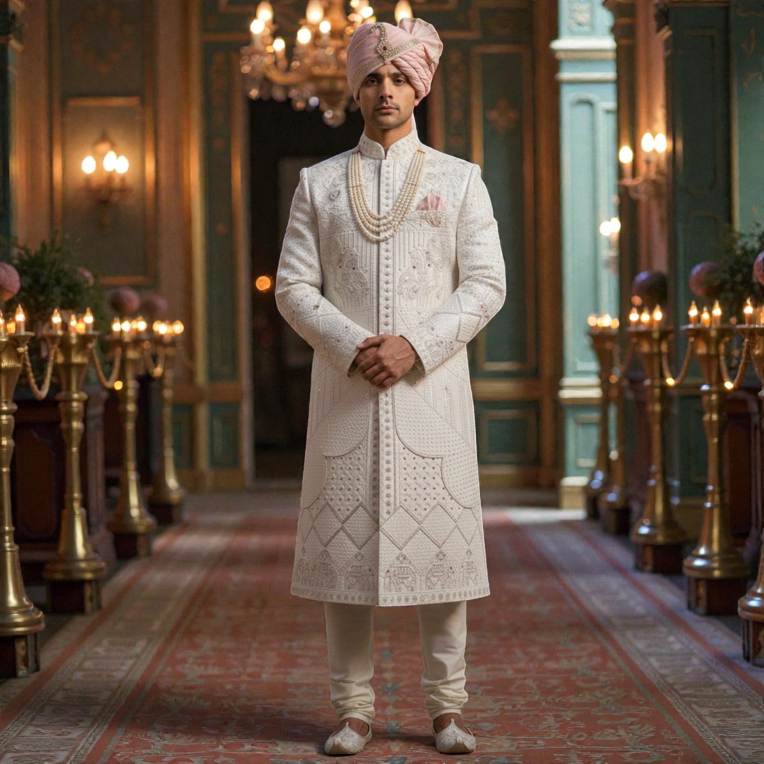 This Sherwani is a pinnacle of traditional craftsmanship, featuring a pristine Off-White base decorated with high-relief tonal embroidery. The design integrates architectural elements with royal animal motifs to create a multi-dimensional, regal look.