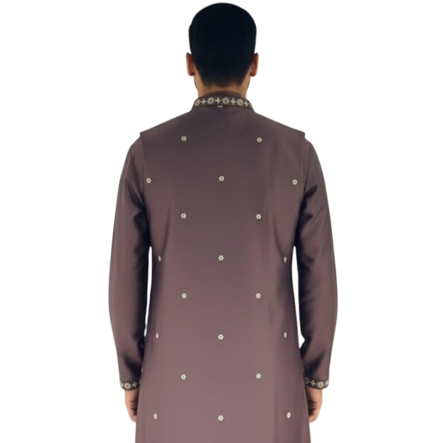 Textured Threadwork Finish: Embroidery mein beige aur cream threads ka use kiya gaya hai jo mauve base par ek elegant contrast aur 3D depth create karta hai.
