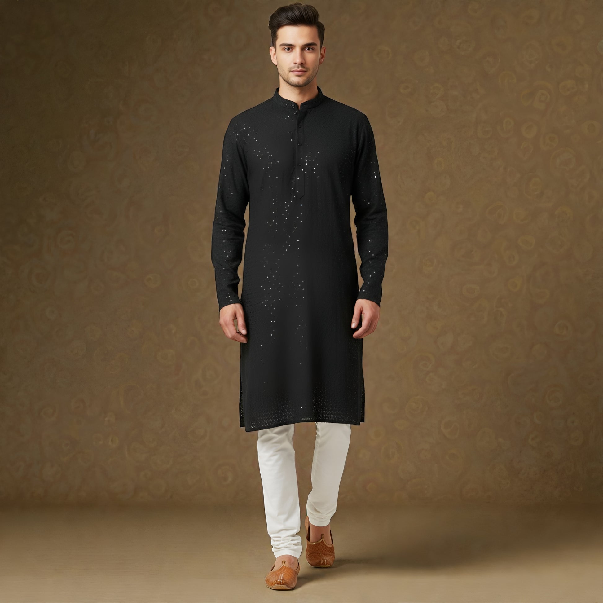 This Jet Black ethnic kurta is the epitome of evening elegance. Crafted from a premium silk blend fabric, it features delicate all-over sequin embroidery that creates a starry, shimmering effect against the deep black backdrop. The minimalist yet luxurious design, combined with a classic Mandarin collar, makes it a perfect choice for reception parties, formal gatherings, or festive night events.