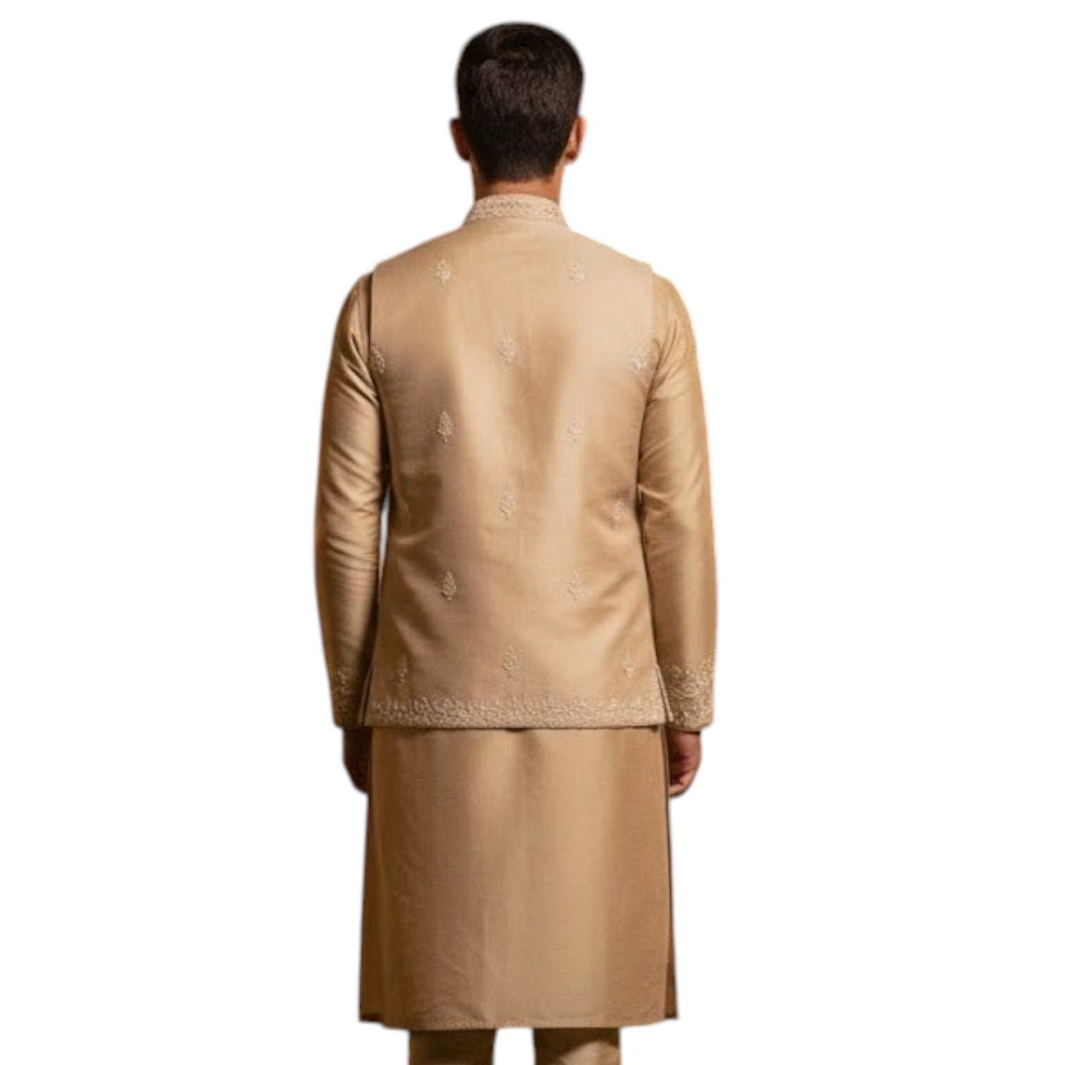 Luminous Beige Silk Canvas: Crafted from a premium Beige/Gold fabric with a soft, royal sheen that captures light beautifully for evening functions.